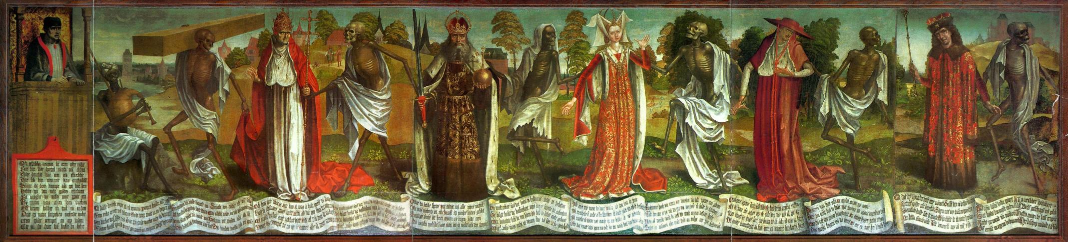 A jednak w średniowiecznej kulturze niezwykle często pojawiało się wyobrażenie łączące obie te, pozornie sprzeczne, rzeczywistości. Chodzi mianowicie o danse macabre. Stanowiło ono topos (czyli powtarzalny, rozpowszechniony i powracający motyw), który pojawiał się zarówno w dziełach literackich, jak i sztukach plastycznych od czasów późnego średniowiecza. Danse macabre (z fr. „taniec śmierci”) to alegoryczny wizerunek korowodu tworzonego przez wielu ludzi różniących się niemal wszystkim: płcią, wiekiem, stanem, pochodzeniem i kondycją społeczną. Jedynym punktem wspólnym jest fakt, iż wszyscy oni biorą udział w dziwacznym tańcu, podążając w makabryczno-komicznych pląsach za śmiercią-wodzirejem.