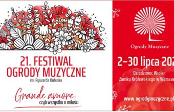 21. Festiwal Ogrody Muzyczne odbędzie się od 2 do 30 lipca 2021 r. w Warszawie, w pawilonie koncertowym na dziedzińcu Zamku Królewskiego w Warszawie, udekorowanym kwiatami. Tegoroczny podtytuł Festiwalu to GRANDE AMORE, czyli WSZYSTKO O MIŁOŚCI.