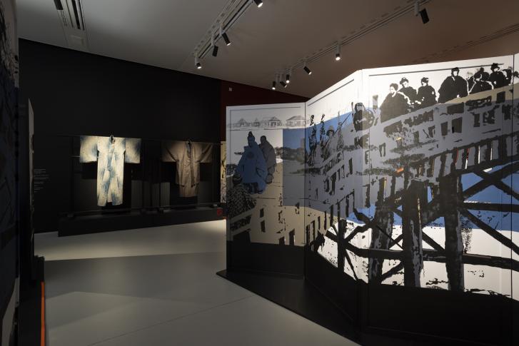 Kolejną część wyznacza błękit pruski. To przestrzeń drukarza ze wszystkimi etapami jego pracy i ukazaniem doskonałych materiałów i narzędzi, którymi pracował. Parawany przedstawiają pory roku i zostały zaprojektowane przez Kaje Muchę. Tutaj możemy ułożyć własne haiku. Hiroshige ilustrował haiku.