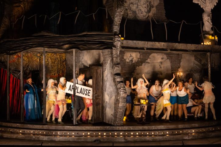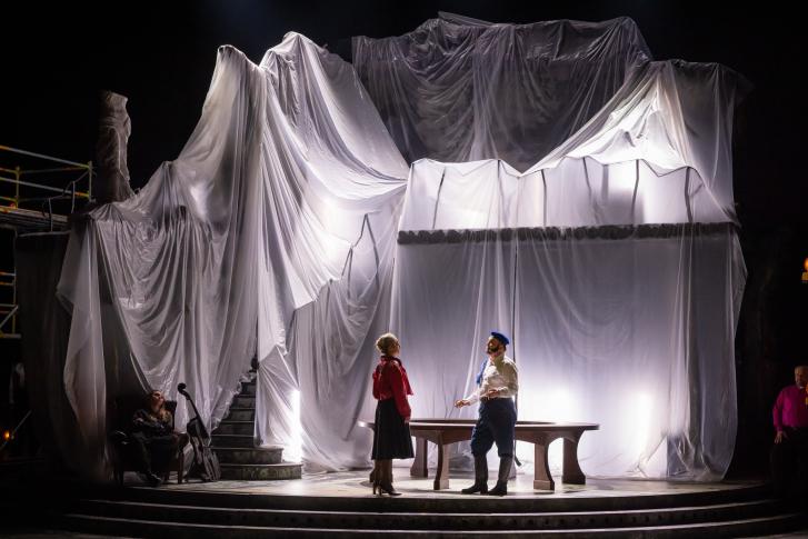 Uwertura w inscenizacji Karoliny Sofulak nie otwiera już salonu, lecz uruchamia obrazy. Ekran wraz z piętrową sceną obrotową tworzą wspólną przestrzeń, jakby sen przenikał się z jawą. Podoba mi się ten pomysł na uwerturę! To błyskotliwy muzyczno-wizualny „trailer” przygotowany w konwencji „starego kina”. Sofulak bawi się pastiszem z niemal „memicznym” poczuciem humoru, a wraz z nią i widz. Groteskowy ruch postaci w projekcjach video autorstwa Karoliny Fender-Noińskiej doskonale otwiera spektakl w tonie lekkiej ironii podszytej kampem.