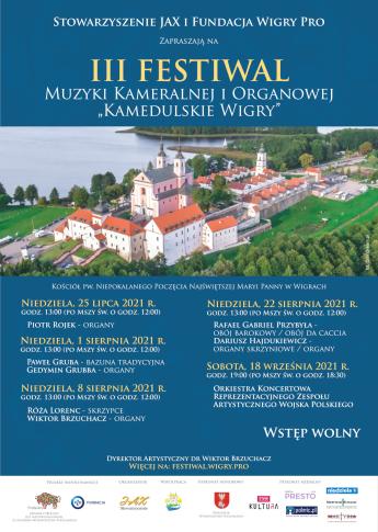 Koncerty w ramach III edycji Festiwalu "Kamedulskie Wigry" odbędą się w wybrane niedziele lipca, sierpnia i września 2021 roku. Przed nami podróż w świat różnorodnych form, stylów muzycznych i ciekawych efektów akustycznych. Zabrzmi także pełna rozpiętość składów instrumentalnych. Usłyszymy organy solo, a także kameralne współbrzmienia króla instrumentów wraz ze skrzypcami, obojem czy rzadko prezentowaną bazuną tradycyjną – kaszubskim instrumentem muzycznym. Wystąpią uznani artyści, którzy od wielu lat aktywnie zaangażowani są w polskie i światowe życie kulturalne – Piotr Rojek, Gedymin Grubba, Paweł Gruba, Róża Lorenc, Wiktor Brzuchacz, Rafael Gabriel Przybyła, Dariusz Hajdukiewicz. Całość zwieńczy występ Orkiestry Koncertowej Reprezentacyjnego Zespołu Artystycznego Wojska Polskiego, liczącej 55 muzyków.