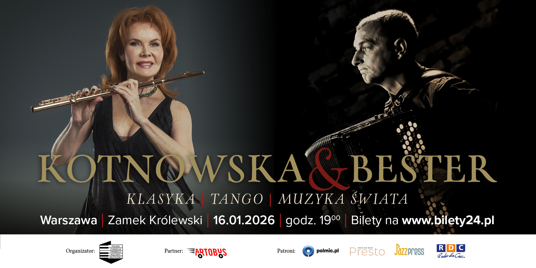 Duet Jadwigi Kotnowskiej i Jarosława Bestera to spotkanie dwóch niezwykle wyrazistych muzycznych osobowości, które łączą w swojej grze i twórczości bogactwo tradycji i nowatorskie podejście do interpretacji. Ich recital na flet i akordeon odkrywa przed słuchaczami pełen przekrój przez style, epoki i emocje w muzyce świata - od klasyki, przez tango i jazz, aż po muzykę współczesną. 16 stycznia 2026 r. zaprezentują go w wyjątkowej scenerii Sali Wielkiej Zamku Królewskiego w Warszawie.