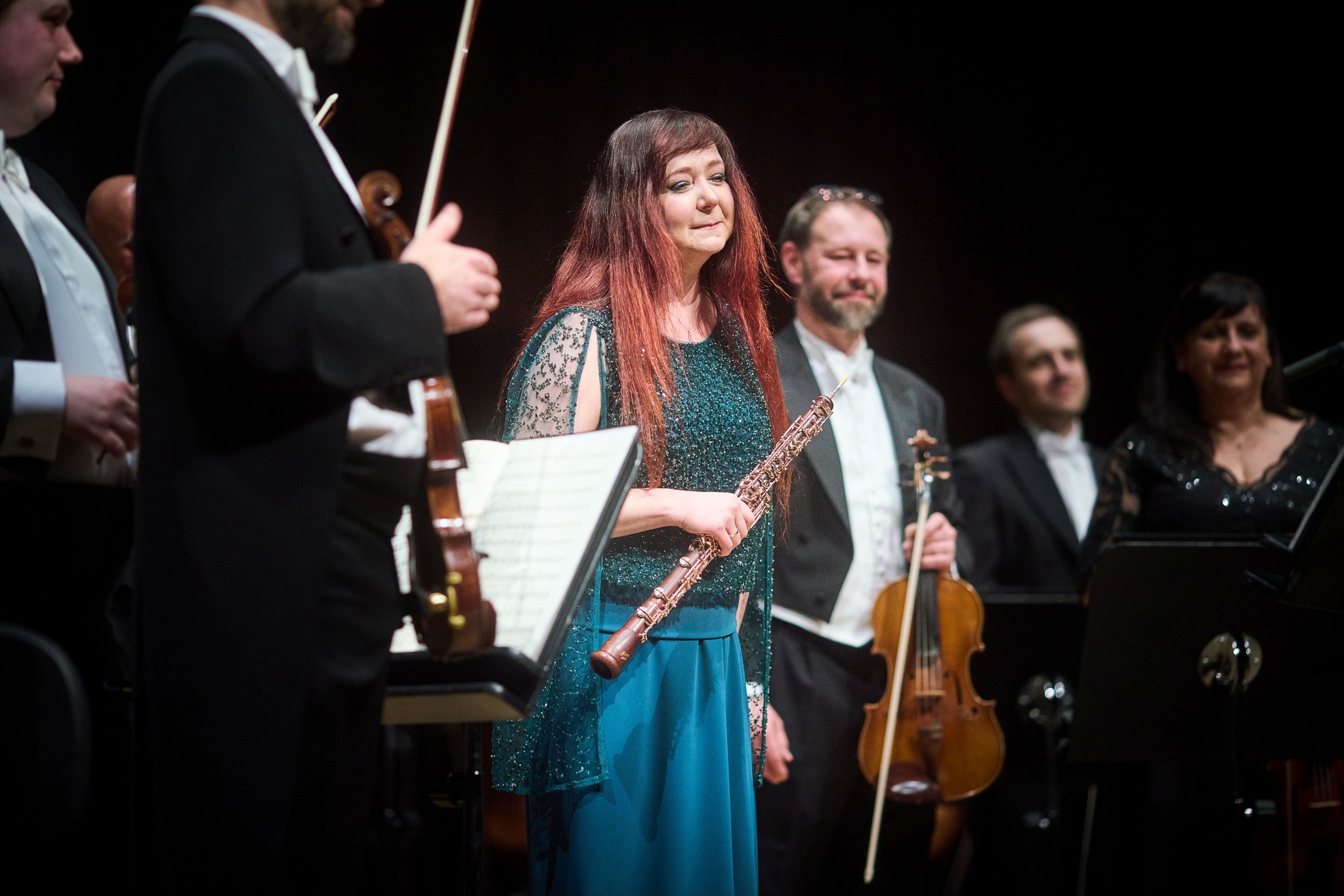 Po Barberze przyszedł czas na porcję mało znanej XX-wiecznej muzyki francuskiej. Na estradzie pojawiła się solistka wieczoru – Agata Piotrowska-Bartoszek – pierwsza oboistka Orkiestry Symfonicznej Filharmonii Łódzkiej. Pracę w orkiestrze łączy z wieloma aktywnościami artystycznymi i pedagogicznymi: koncertuje jako solistka i kameralistka w kraju i za granicą, wykłada w macierzystej Akademii Muzycznej w Łodzi na stanowisku profesora oraz prowadzi kursy dla młodych adeptów instrumentu. Pani Agata zaprezentowała wirtuozowski Koncert na obój i orkiestrę Henriego Tomasiego. Eklektyzm tej kompozycji – korsykański temperament w szybkich pasażach, precyzja i dźwięki rozrzucone po krańcach skali – był idealnym polem do popisu dla technicznej sprawności i muzykalności artystki. W rękach Piotrowskiej-Bartoszek pięknie zaprezentował się tego wieczora nowy instrument zakupiony przez Filharmonię Łódzką. Warto zauważyć, że blask solistki był wspierany przez równie znakomite partnerki z sekcji dętej drewnianej. W dialogach z obojem nie ustępowały koleżance klarnecistka Maria Owczarek oraz fagocistka Dorota Cegielska, tworząc razem misterną, niemal kameralną strukturę dźwiękową wewnątrz orkiestry