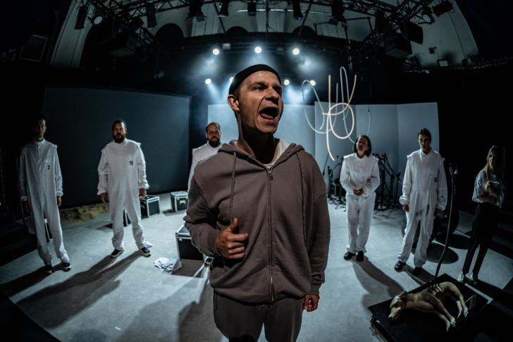Na premierę Psa poszedłem więc zaciekawiony, nie wiedząc, czego się spodziewać. W Grotesce zazwyczaj obejrzeć można było spektakle lalkowe bądź lalkowo-aktorskie. Tym razem – spektakl czysto aktorski. Inscenizacja powieści młodzieżowej Marka Haddona z 2003 roku, zaadaptowanej jako sztuka teatralna przez Simona Stephensa, została zrealizowana przez reżyserkę Agatę Biziuk-Brajczewską. Interesująca, choć nie niespotykana, jest prawie całkowita rezygnacja ze scenografii: za wszystkie obiekty służy nam sześć skrzyń i instalacja świetlna, o której jeszcze wspomnę. Obecność kostiumów jako elementów charakterystycznych dla danej postaci też jest śladowa – poza głównym bohaterem, Christopherem, i jego tutorką, Siobhan, wszyscy ubrani są w bezkształtne kombinezony, co daje nam obraz obcowania z bohaterem zbiorowym.