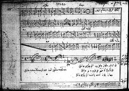 Ali Ufki (1610? – 1675?), o którym opowiem później szczegółowo, zachował setki klasycznych pieśni osmańskich i utworów instrumentalnych, zapisując je w zachodnim zapisie pięcioliniowym. Był to pierwszy przypadek zastosowania zachodniego zapisu pięcioliniowego do muzyki tureckiej.