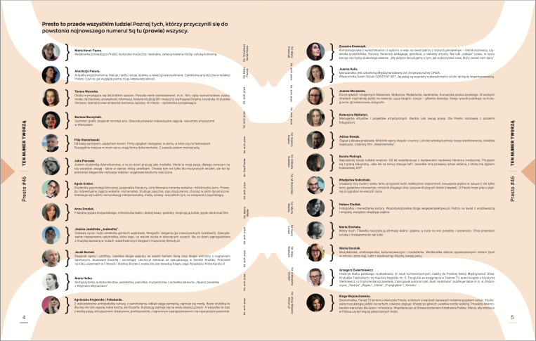 Ciągle szukamy nowych osób, które chciałyby współpracować z Presto. Ciągle też odkrywamy się dla nowych Czytelników. Cieszą nas rozmowy i spotkania z nimi. Dla nich Presto ciągle się zmienia, ufamy, że na lepsze.