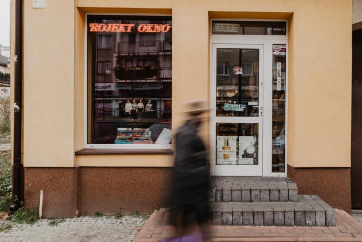Bożena Wydrowska: Moim zadaniem było zaaranżowanie witryny w księgarni Lektura w Żyrardowie. Współpracę rozpoczęłam od rozmów na temat miasta z panem Piotrem – właścicielem księgarni oraz panią Krystyną pracującą w ERGO Hestii. Któregoś dnia poszłam do Muzeum Lniarstwa w Żyrardowie. Dowiedziałam się, że Żyrardów był miejscem pierwszego strajku w Polsce, zainicjowanego przez szpularki pracujące w fabryce lnu. Wszystko pokryło się też z okresem ostatnich strajków związanych z zaostrzeniem prawa aborcyjnego. To był bardzo intensywny czas. Wracając na pociąg, zauważyłam ogłoszenie dotyczące otwartych prób Towarzystwa Śpiewaczego Lira – założonego przez pracowników tejże fabryki 125 lat temu. Można było przyjść na spotkania i posłuchać. Wtedy wszystko się wyklarowało. W swojej praktyce performatywnej bardzo interesuję się głosem i pracą z ciałem. Poszłam tam i to, co mnie zainteresowało, to siła kobiecego głosu i zmienianie rzeczywistości właśnie poprzez ten głos. Ostatecznie w witrynie było wyświetlane wideo, na którym panie wykonywały rozgrzewkę oddechowo-głosową, a we wnętrzu księgarni wideo z utworem patriotycznym „Tu wszędzie jest moja ojczyzna”, który wykonywałam wraz z paniami. Było to mocne doświadczenie, ponieważ w pamięci wciąż miałam pierwsze spotkanie z chórem, podczas którego za oknem było słychać strajkujących ludzi i policję. Było też widać czerwone światła i flary – a my wspólnie w sali śpiewałyśmy tę pieśń. Gdy pojawiają się takie możliwości współpracy, warto się ich podejmować i poprzez wspólne działanie wpływać na świadomość swoją i innych.