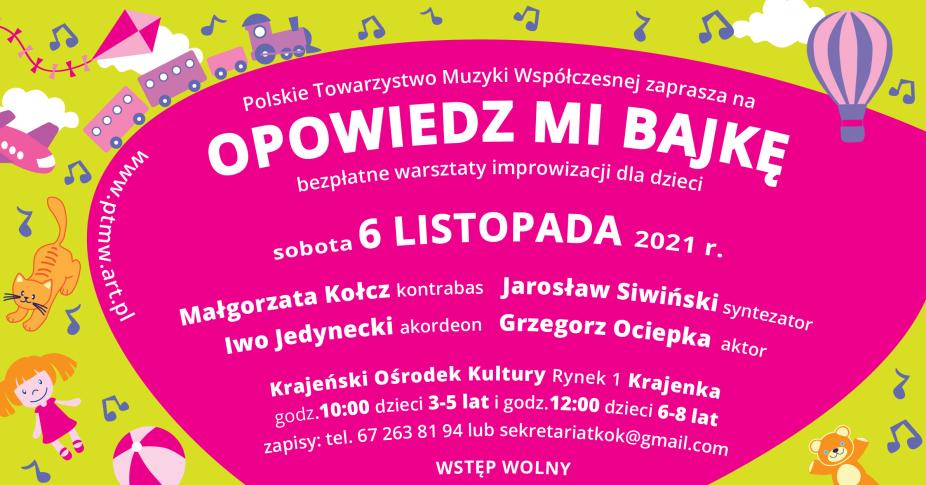 Warsztaty odbędą się w sobotę 6 listopada br. Organizatorem jest Polskie Towarzystwo Muzyki Współczesnej, a ich gospodarzem Krajeński Ośrodek Kultury (Rynek 1, Krajenka).