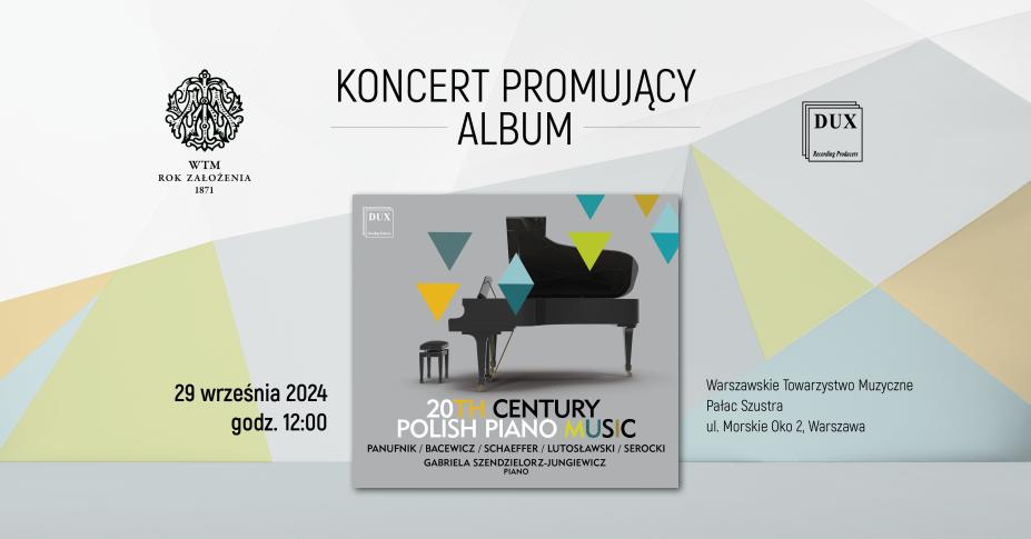 Pianistka Gabriela Szendzielorz-Jungiewicz powraca do słuchaczy z nowym albumem nagranym dla wytwórni DUX, złożonym z pięciu cykli fortepianowych wybitnych polskich kompozytorów. 29 września artystka wystąpi w Warszawie w siedzibie Warszawskiego Towarzystwa Muzycznego.