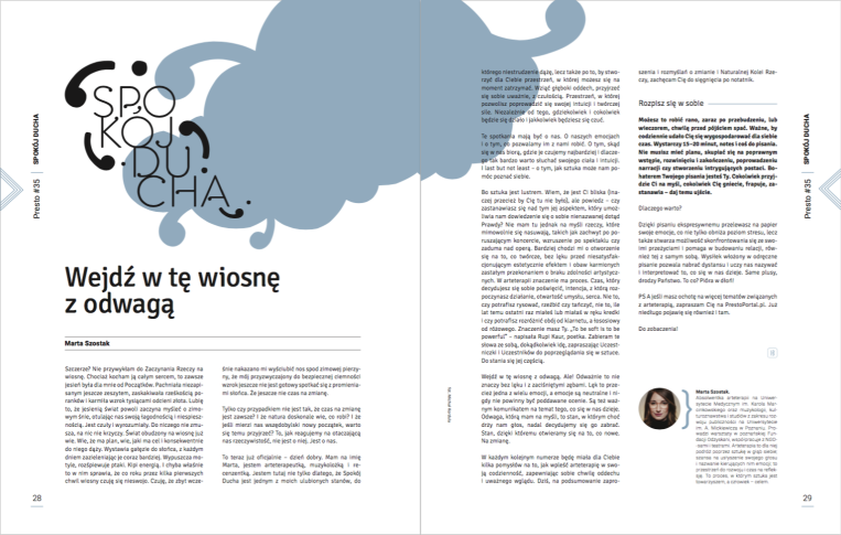 Kinga A. Wojciechowska: Gdy ponad 10 lat temu zaczęłam tworzyć Presto, do głowy mi nie przyszło, że w 2022 r. będę prowadzić kilkudziesięcioosobowe wydawnictwo, w ramach którego będzie działać Presto artbook – czasopismo dla dorosłych, Presto Junior – kwartalnik dla dzieci, dynamiczny portal. Że będę realizować projekty typu custom publishing – czyli wydawać czasopisma dla wybranych instytucji kultury. I że to wcale nie będzie moje ostatnie słowo, bo w głowie kiełkują mi już kolejne pomysły. Czekam tylko na odpowiedni moment, aby je zrealizować.