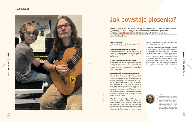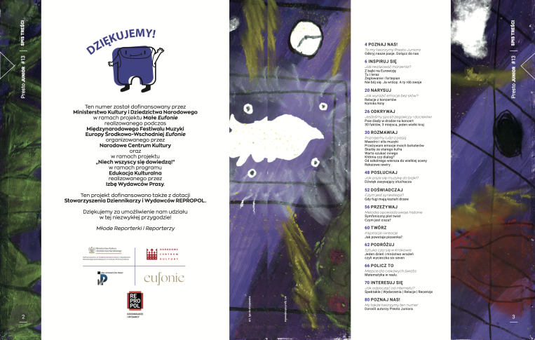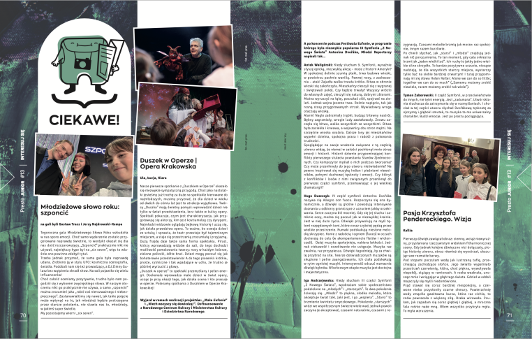 Młodzi Reporterzy i Reporterki rozmawiali m.in.: z Celiną Kukuczką, żoną Jerzego Kukuczki, himalaisty, z Jerzym Maksymiukiem, dyrygentem, kompozytorem, pianistą, z Olgą Pasiecznik, sopranistką, z Rafałem Christą, gitarzystą i kompozytorem, z Pawłem Siechowiczem, muzykologiem, ale ciekawych gości w tym numerze jest więcej.
