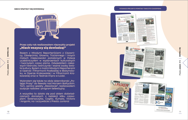 Niech wszyscy się dowiedzą! – realizowany przez Izbę Wydawców Prasy, z inicjatywy Kingi Wojciechowskiej, właścicielki Presto Juniora. W ten projekt włączyły się wydawnictwa zrzeszone w Izbie: Nowa Era – wydawca „Świerszczyka”, Westa Druk – wydawca „Angorki” i Grupa Cogito – wydawca Cogito, Kumpla i Victora.