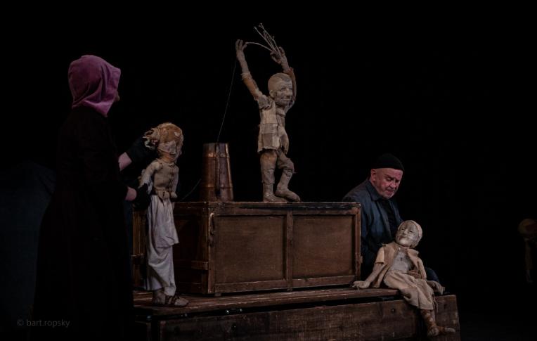 Udobruchana „Groteskowym” wystrojem zasiadłam w Sali Kopułowej, która idealna jest do przedstawień wymagających bezpośredniej interakcji z widzem. Nad głowami, ukryta w gęstwinie materiału, chowa się charakterystyczna kopuła kamienicy, a całą salę spowija jakiś nieuchwytny mrok, cisza, tajemnica. I oto na obitą brzydką wykładziną scenę wchodzi dwóch brzydko ubranych aktorów. Zaczynają machać starą szmatą, z której – wydaje się – nikt nie wytrzepywał kurzu przez dziesiątki lat. Spektakl zaczyna się, a ducha romantyzmu trudno wyczuć. Zwłaszcza gdy spod szmaty wyłania się skrzypiący drewniany wóz. Westchnęłam ciężko, powtarzając w myśli, że naprawdę nie lubię brzydkiego teatru.