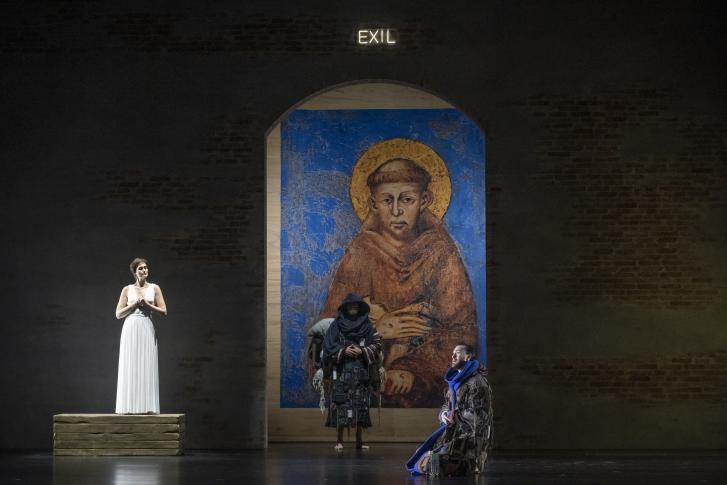 Reżyserem tego monumentalnego dzieła w Grand Théâtre de Genève jest Adel Abdessemed. Nie jest on profesjonalnym reżyserem, ale artystą plastykiem, który pracuje z różnorodnymi mediami, tworząc rzeźby, instalacje, animacje i performance. W swojej produkcji Saint François d’Assise Abdessemed nie tworzy spójnej narracji, ale raczej oddzielne sceny, które są współczesną medytacją nad przesłaniem św. Franciszka. Sama muzyka Messiaena nie jest specjalnie progresywna, więc sceny, którymi reżyser ją ilustruje, wydają się subtelnie oddawać nastrój muzyki. Artysta wychodzi od symboli związanych z monoteizmem, aby zakończyć duchową podróż znakami przywołującymi buddyjskie mandale. Jednak nie to jest tutaj najistotniejsze. Bardzo interesujący jest portret samego Franciszka, współczesnego bezdomnego, odzianego w łachy i pchającego pusty wózek z supermarketu. Dla Abdessemeda Franciszek reprezentuje to, co dziś wyparte z przestrzeni publicznej, ludzi często niedostrzeganych, marginalizowanych. Nie ma tutaj żadnego dramatycznego aktorstwa, rzucania się po scenie. Ruch sceniczny jest dość ograniczony. Reżyser tworzy niejako obrazy, które mają skłaniać do zadumy. Sama akcja wydaje się drugorzędna. Motyw ptaków jest istotny w tej operze. Pojawia się tutaj długa scena, gdzie muzyka oddaje ptasie śpiewy. Dla kontrastu reżyser umieszcza na scenie ogromnego, krwawiącego gołębia. Symbol pokoju jest bezradny wobec wszechobecnego okrucieństwa. Całość zmierza ku prostocie. W ostatniej scenie w zasadzie nie ma już żadnej scenografii. Franciszek umiera w otoczeniu kilku bliskich osób – jak być może co noc gdzieś na świecie umiera bezdomna osoba. Abdessemed nie daje nam łatwej możliwości zrozumienia Franciszka ani klucza do jego świata. Operuje on symbolami, które chwilami trzymają widza na dystans, to znów tworzą poczucie pewnej dziwnej intymności, jak w przypadku sceny z trędowatym. Abdessemed stworzył wysokiej jakości sztukę wizualną, która bardzo dobrze oddaje nastrój muzyki Messiaena.