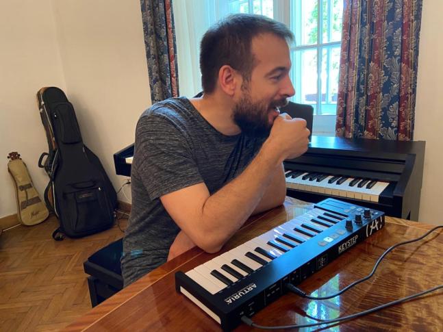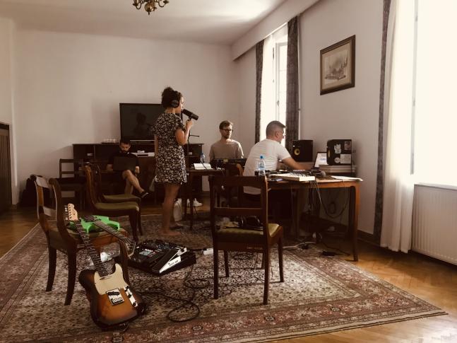 – Daj takie grube akordziska, w c-moll. – Tomek instruuje Mateusza, ustawiając mu mikrofon do nagrania. – Nie rób tercji, bo nie wiemy, czy nie będę czegoś dogrywał. I może jakieś jazzowe składniki? – Mateusz się przymierza do nagrania, a Tomek chodzi po sali i eksperymentuje z burzownicą.