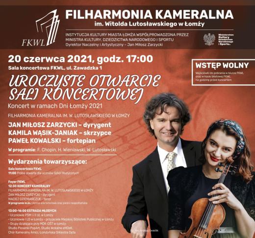 W niedzielę 20 czerwca 2021 roku o godzinie 17:00 nastąpi długo wyczekiwany przez muzyków i melomanów moment. Filharmonia Kameralna im. Witolda Lutosławskiego w Łomży uroczystym koncertem otworzy wyremontowaną salę koncertową. Jako soliści wystąpią: Kamila Wąsik (skrzypce) oraz Paweł Kowalski (fortepian), a Orkiestrę Filharmonii Kameralnej w Łomży poprowadzi Jan Miłosz Zarzycki. Wstęp na koncert jest wolny, wejściówki do pobrania w biurze FKWL oraz w kasie biletowej FKWL na godzinę przez koncertem. Koncert odbywa się w ramach Dni Łomży 2021.