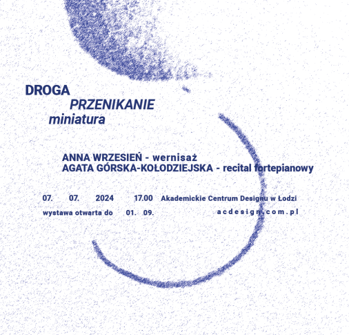 „Droga, Przenikanie, Miniatura” to wernisaż wystawy prac artystki i projektantki dr Anny Wrzesień oraz recital fortepianowy pianistki dr hab. Agaty Górskiej-Kołodziejskiej. To, co Państwo zobaczą i usłyszą, będzie „synkretycznym odbiciem schematu życiowej podróży artysty ujętym w wizualnej i muzycznej – w tym przypadku chopinowskiej – miniaturze. Kompozycje zostały dobrane w taki sposób, by rękoma pianistki ukazać w małej formie kluczowe dla twórcy momenty. Muzyka koresponduje w tym wymiarze z dziełami wizualnymi, przenika je, czerpie inspirację z podobnych źródeł i skojarzeń oraz podejmuje próbę wzajemnej ilustracji i oddziaływania”.