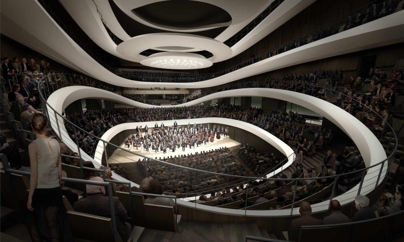 Drugi etap inwestycji zakłada budowę głównej sali koncertowej Sinfonii Varsovii na 1877 miejsc, zaprojektowanej we współpracy z akustykami z Müller-BBM z Berlina oraz Eckhard Kahle Acoustics z Brukseli. Model akustyczny sali stanowi połączenie układów shoebox i vineyard, z widownią wokół sceny. Sala koncertowa będzie w pełni widoczna z okalającego ją obszernego foyer, otwartego dla wszystkich odwiedzających, dzięki wysokim przeszklonym ścianom. W drugim etapie inwestycji powstaną również sala kameralna na około 400 miejsc, sale prób, magazyny, zaplecze artystyczne i techniczne; prace obejmą także renowację dwóch północnych oficyn, które zostaną połączone z nowym budynkiem z główną salą koncertową, oraz budowę promenady z tarasem widokowym.